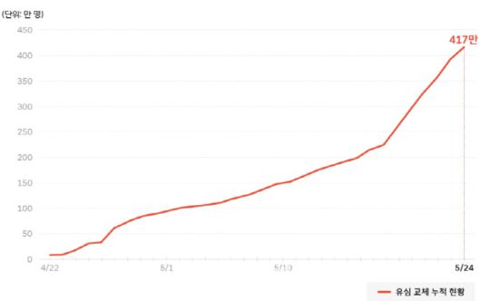 25일 SK텔레콤 뉴스룸 공지에 따르면 전일 하루 동안 30만명이 유심을 교체해 누적으로 417만명이 교체완료 했다. 남은 예약 고객은 482만명이다.