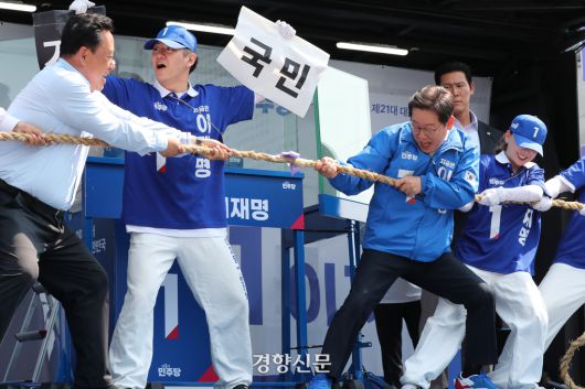 이재명 더불어민주당 대선 후보가 25일 오후 충남 당진전통시장 유세장에서 줄다리기 퍼포먼스를 하고 있다. 박민규 선임기자 |