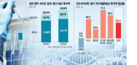 올 1분기 5대 국내 제약·바이오 기업들의 연구개발(R&D) 규모가 3000억 원을 넘어섰다. 시가총액 상위 바이오텍 5곳의 올 1분기 R&D 투자 증가율은 40%로 5대 제약사의 5배에 달했다. 매출 상위 5대 제약사의 투자 증가율은 바이오텍에 뒤쳐졌지만 투자 규모에서는 바이오텍의 3배가 넘는 2300억 대를 쏟아 부었다. 미국의 약가 인하와 관세 부과 등 불확실한 대내외 환경 속에서 생존을 위한 길은 R&D를 통한 신약 개발과 차별화라는 데 공감대가 형성되는 분위기다.