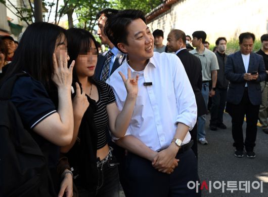 아시아투데이 박성일 기자 = 이준석 개혁신당 대선 후보가 25일 오후 서울 종로구 서순라길 유세에서 시민들과 사진을 찍고 있다.