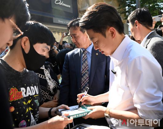 아시아투데이 박성일 기자 = 이준석 개혁신당 대선 후보가 25일 오후 서울 종로구 서순라길 유세에서 시민들에게 사인을 해주고 있다.