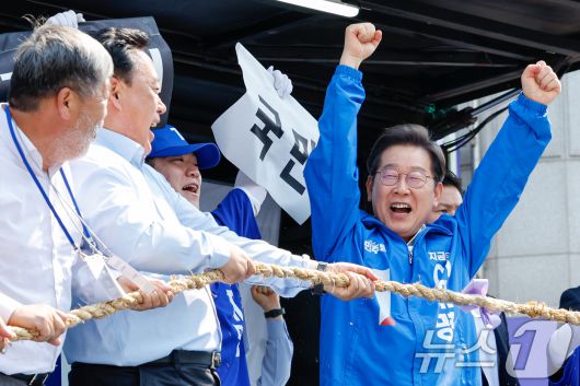 이재명 더불어민주당 대통령 후보가 캐스팅보트인 충청권 공략에 나선 25일 오후 충남 당진전통시장을 찾아 기득권과 국민의 줄다리기 중 국민이 이긴다는 의미의 퍼포먼스를 하고 있다. 2025.5.25/뉴스1 ⓒ News1 안은나 기자 |