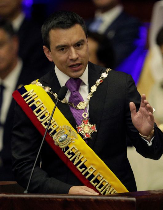 로이터 등 외신에 따르면 노보아 대통령은 이날 수도 키토의 국회에서 열린 취임 선서식 후 연설에서 “살인 사건을 줄이는 것을 협상의 여지없는 목표로 삼을 것”이라며 “마약 밀매와의 전쟁을 지속하고, 불법무기와 폭발물 등을 압수하며 항구 통제력을 강화하겠다”고 말했다.