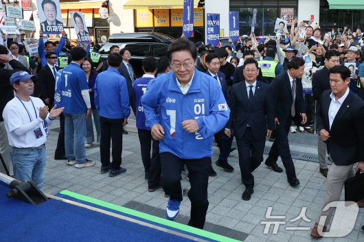 (아산=뉴스1) 안은나 기자 = 이재명 더불어민주당 대통령 후보가 캐스팅보트인 충청권 공략에 나선 25일 오후 충남 아산시 탕정역 한들물빛공원을 찾아 유세차량에 오르고 있다. 2025.5.25/뉴스1coinlocker@news1.krCopyright ⓒ 뉴스1. All rights reserved. 무단 전재 및 재배포, AI학습 이용 금지.