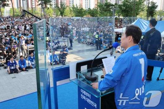 (아산=뉴스1) 안은나 기자 = 이재명 더불어민주당 대통령 후보가 캐스팅보트인 충청권 공략에 나선 25일 오후 충남 아산시 탕정역 한들물빛공원을 찾아 지지를 호소하고 있다. 2025.5.25/뉴스1