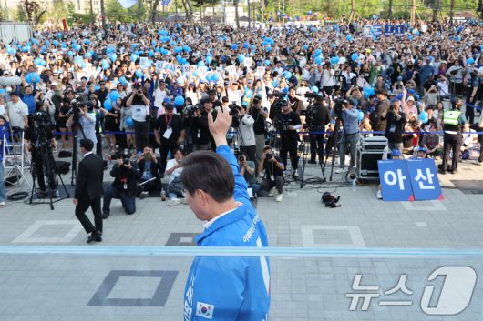 (아산=뉴스1) 안은나 기자 = 이재명 더불어민주당 대통령 후보가 캐스팅보트인 충청권 공략에 나선 25일 오후 충남 아산시 탕정역 한들물빛공원을 찾아 유세를 마친 뒤 인사하고 있다. 2025.5.25/뉴스1coinlocker@news1.krCopyright ⓒ 뉴스1. All rights reserved. 무단 전재 및 재배포, AI학습 이용 금지.
