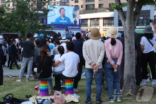 (아산=뉴스1) 안은나 기자 = 이재명 더불어민주당 대통령 후보가 캐스팅보트인 충청권 공략에 나선 25일 오후 충남 아산시 탕정역 한들물빛공원을 찾아 지지를 호소하는 가운데 시민들이 이 후보의 연설을 지켜보고 있다. (공동취재) 2025.5.25/뉴스1