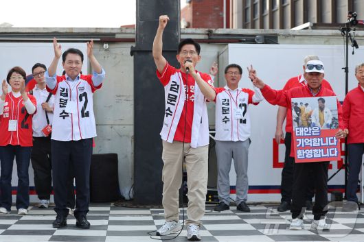 (서산=뉴스1) 김민지 기자 = 김문수 국민의힘 대통령 후보가 25일 오후 충남 서산시 중앙통 로데오거리에서 집중유세를 하고 있다. (공동취재) 2025.5.25/뉴스1