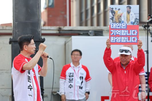 (서산=뉴스1) 김민지 기자 = 김문수 국민의힘 대통령 후보가 25일 오후 충남 서산시 중앙통 로데오거리에서 집중유세를 하고 있다. (공동취재) 2025.5.25/뉴스1