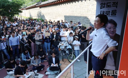 아시아투데이 박성일 기자 = 이준석 개혁신당 대선 후보가 25일 오후 서울 종로구 서순라길 유세에서 거리 유세를 하고 있다.