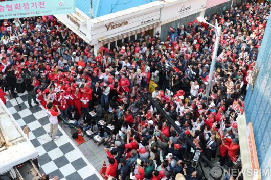 [서산=뉴스핌] 최지환 기자 = 김문수 국민의힘 대선 후보가 25일 충남 서산시 중앙통 로데오 거리에서 유세를 하고 있다. 2025.05.25 choipix16@newspim.com