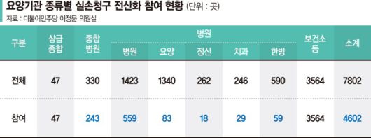 25일 국회 정무위원회 소속 더불어민주당 이정문 의원이 보험개발원에서 받은 자료에 따르면 이달 15일 기준 전체 대상 요양기관(병원급 의료기관·보건소) 7802곳 가운데 4602곳(59%)이 실손 청구 간소화 서비스에 참여하고 있다.