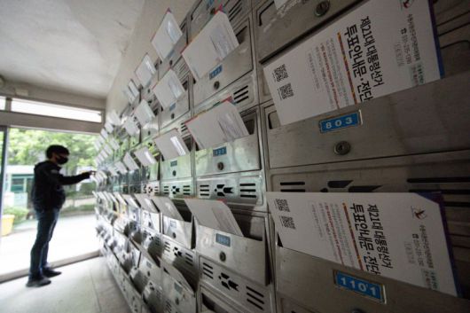 지난 24일 경기 수원시의 한 아파트 단지의 우편함에 제21대 대선 관련 투표 안내문 및 전단형 선거공보물이 도착한 가운데 한 주민이 이를 살펴보고 있다.뉴스1 |