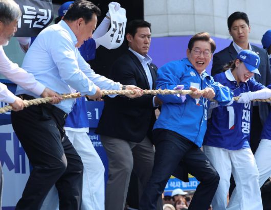 기득권과 줄다리기 벌이는 李 이재명 더불어민주당 대선 후보(오른쪽 두번째)가 25일 중원 공략에 나선 가운데 충남 당진시 당진전통시장에서 열린 유세에서 '국민편 대(對) 기득권편 줄다리기' 퍼포먼스를 하고 있다. 연합뉴스 |