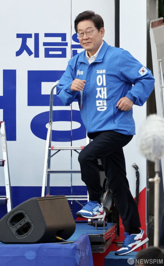 [아산=뉴스핌] 김학선 기자 = 이재명 더불어민주당 대선 후보가 25일 오후 충남 아산시 탕정역 한들물빛공원에 마련된 유세차에 오르고 있다. 2025.05.25 yooksa@newspim.com