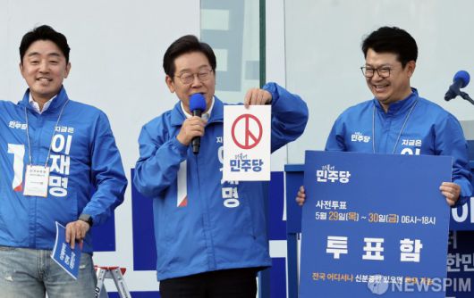 [아산=뉴스핌] 김학선 기자 = 이재명 더불어민주당 대선 후보가 25일 오후 충남 아산시 탕정역 한들물빛공원에서 유세에 앞서 사전투표를 독려하고 있다. 2025.05.25 yooksa@newspim.com