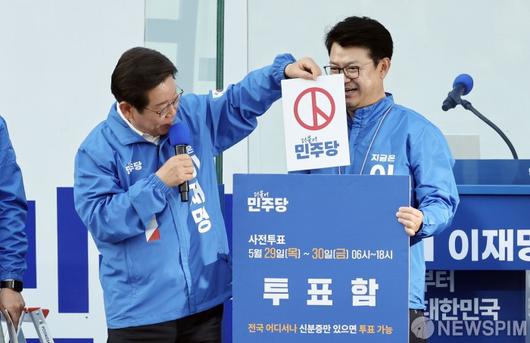 [아산=뉴스핌] 김학선 기자 = 이재명 더불어민주당 대선 후보가 25일 오후 충남 아산시 탕정역 한들물빛공원에서 유세에 앞서 사전투표를 독려하고 있다. 2025.05.25 yooksa@newspim.com