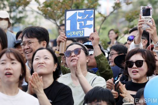 [아산=뉴스핌] 김학선 기자 = 이재명 더불어민주당 대선 후보 지지자들이 25일 오후 충남 아산시 탕정역 한들물빛공원에서 환호하고 있다. 2025.05.25 yooksa@newspim.com