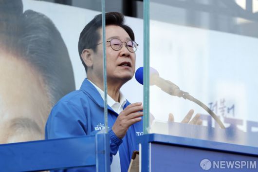 [아산=뉴스핌] 김학선 기자 = 이재명 더불어민주당 대선 후보가 25일 오후 충남 아산시 탕정역 한들물빛공원에서 유세하고 있다. 2025.05.25 yooksa@newspim.com
