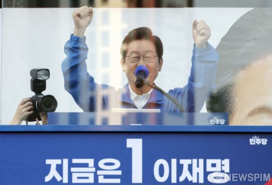 [아산=뉴스핌] 김학선 기자 = 이재명 더불어민주당 대선 후보가 25일 오후 충남 아산시 탕정역 한들물빛공원에서 유세하고 있다. 2025.05.25 yooksa@newspim.com