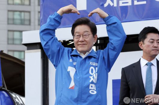 [아산=뉴스핌] 김학선 기자 = 이재명 더불어민주당 대선 후보가 25일 오후 충남 아산시 탕정역 한들물빛공원에서 유세하고 있다. 2025.05.25 yooksa@newspim.com