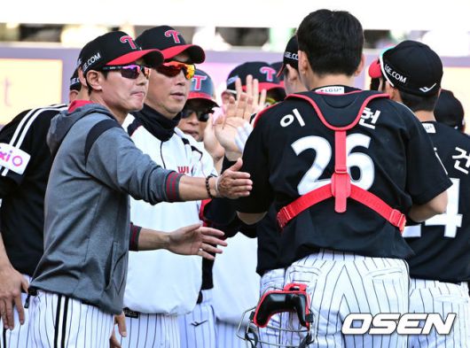 [OSEN=인천, 조은정 기자]프로야구LG 트윈스가 SSG 랜더스 상대로 위닝에 성공했다. LG는 25일 인천 SSG랜더스필드에서 열린 2025 KBO리그 SSG와 경기에서 9-3으로 승리했다.선두 LG는 이날 승리로 33승 1무 18패가 됐다. SSG는 25승 1무 25패로 승률 5할이 됐다. LG 염경엽 감독이 이주헌과 승리를 기뻐하고 있다. 2025.05.25 /cej@osen.co.kr