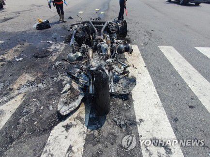 이 사고로 오토바이 운전자인 60대 A씨와 승합차 운전자가 경상을 입었고, 오토바이에서 불이나 소방서 추산 8천140만원의 재산 피해를 내고 33분 만에 꺼졌다.