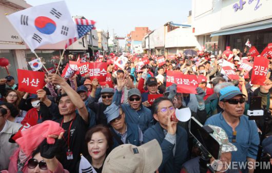 [서산=뉴스핌] 최지환 기자 = 25일 오후 충남 서산시 로데오거리에서 열린 김문수 국민의힘 대선후보 유세 현장에서 지지자들이 연호하고 있다. 2025.05.25 choipix16@newspim.com |