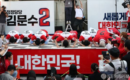 [서산=뉴스핌] 최지환 기자 = 김문수 국민의힘 대선후보가 25일 오후 충남 서산시 로데오거리에서 열린 유세 현장에서 큰 절을 하고 있다. 2025.05.25 choipix16@newspim.com |