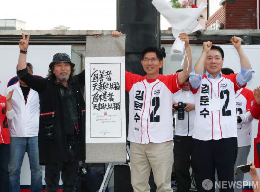 [서산=뉴스핌] 최지환 기자 = 김문수 국민의힘 대선후보가 25일 오후 충남 서산시 로데오거리에서 열린 유세 현장에서 "위선자 천보지이복 위불선자 천보지이화"라고 적힌 족자를 받고 기념촬영하고 있다. 2025.05.25 choipix16@newspim.com |