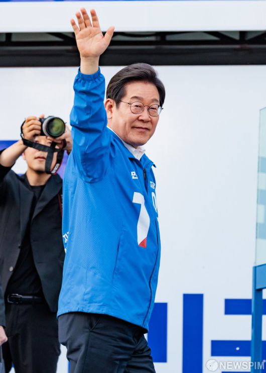 [아산=뉴스핌] 김학선 기자 = 이재명 더불어민주당 대선 후보가 25일 오후 충남 아산 한들물빛공원에서 열린 집중유세에서 지지를 호소하고 있다. 2025.05.25 yooksa@newspim.com