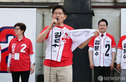 [서산=뉴스핌] 최지환 기자 = 김문수 국민의힘 대선후보가 25일 오후 충남 서산시 로데오거리에서 열린 유세 현장에서 선거운동복을 벗으며 "방탄복을 입지 않았다"고 말하고 있다. 2025.05.25 choipix16@newspim.com