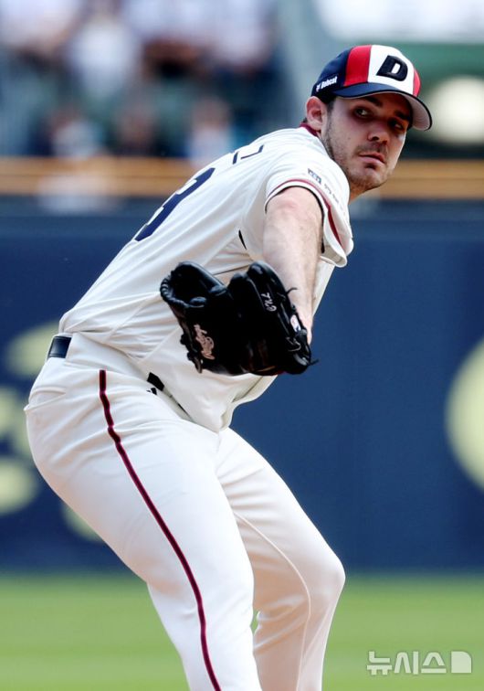 [서울=뉴시스] 추상철 기자 = 25일 오후 서울 송파구 잠실야구장에서 열린 2025 KBO리그 NC 다이노스와 두산 베어스의 경기, 두산 선발투수 잭로그가 역투하고 있다. 2025.05.25. scchoo@newsis.com |