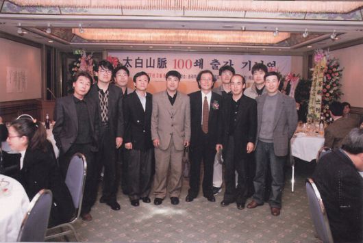 1997년 조정래 대하소설 ‘태백산맥’ 100쇄 출간 잔치에서 조정래 작가(앞줄 오른쪽에서 셋째)와 함께 기념사진을 찍는 소설가 김영현(앞줄 오른쪽에서 둘째). 두 사람 사이로 얼굴이 보이는 이가 소설가 김남일이다. 김남일 제공 |