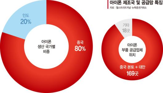 25일(현지시간) 미 테크업계에 따르면 현재 애플은 아이폰의 80%를 중국에서 생산중이다. 애플이 중국의 생산 시설을 인도를 비롯한 베트남과 태국 등으로 이전하거나 이전중이지만 절대적으로 아이폰 생산을 중국에 의존하고 있는 것이다. 이 때문에 중국 공장에 문제가 생기면 아이폰 생산에 아주 큰 타격을 입는 구조다.