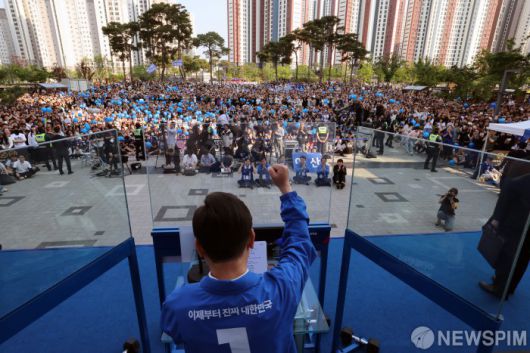[아산=뉴스핌] 김학선 기자 = 이재명 더불어민주당 대선 후보가 25일 충남 아산 탕정역 한들물빛공원에서 열린 유세에서 연설하고 있다. 2025.05.25 yooksa@newspim.com