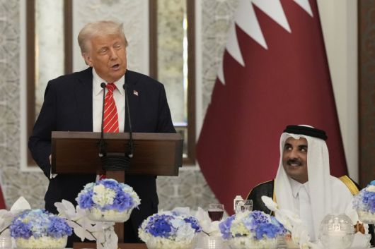 도널드 트럼프(왼쪽) 미국 대통령이 타밈 빈 하마드 알사니 카타르 국왕과 함께 지난 14일(현지 시간) 도하의 루사일 궁에서 열린 국빈 만찬에 참석해 연설하고 있다. AP뉴시스 |