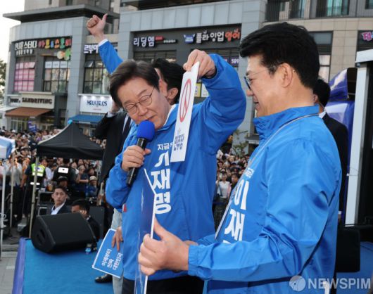 [아산=뉴스핌] 김학선 기자 = 이재명 더불어민주당 대선 후보가 25일 충남 아산 탕정역 한들물빛공원에서 열린 유세에서 사전투표 퍼포먼스를 하고 있다. 2025.05.25 yooksa@newspim.com