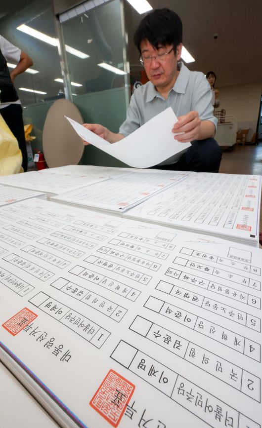 제21대 대통령선거를 9일 앞둔 25일 경기 수원시의 한 출력 인쇄업체에서 관계자가 투표용지를 검수하고 있다. 사진=뉴시스 |