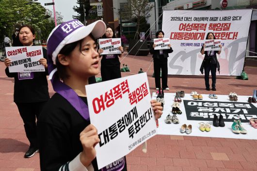 지난 4월27일 서울 홍대입구역 인근에서 젠더폭력 해결 페미니스트 연대 주최로 ‘2025 대선, 여성폭력 해결! 나중은 없다!’ 캠페인이 진행되고 있다. 연합뉴스 |