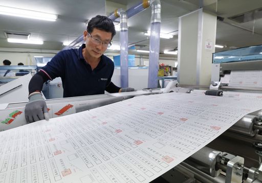 제21대 대통령선거 투표용지 인쇄가 시작된 25일 경기 안양시 동안구의 한 인쇄소에서 관계자가 투표용지 인쇄 상태를 점검하고 있다. 이날 인쇄 개시로 후보 단일화 효과를 극대화하기는 어려워졌으며, 이후 단일화가 이뤄져도 투표용지에는 ‘사퇴’가 표기되지 않고 투표소에만 안내문이 게시된다. 안양=이재문 기자 ⓒ 세상을 보는 눈, 세계일보