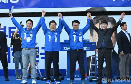 [아산=뉴스핌] 김학선 기자 = 이재명 더불어민주당 대선후보가 25일 오후 충남 아산시 탕정 한들물빛공원에서 열린 집중유세에서손을 맞잡고 들어보이고 있다. 왼쪽부터 강훈식 의원, 이 후보, 복기왕 의원, 박문성 축구 해설위원. 2025.05.25 yooksa@newspim.com |