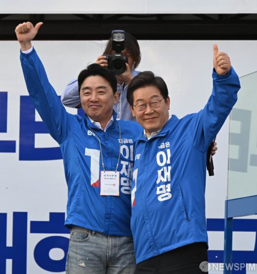 [아산=뉴스핌] 김학선 기자 = 이재명 더불어민주당 대선후보가 25일 오후 충남 아산시 탕정 한들물빛공원에서 열린 집중유세에서 강훈식 의원과 손을 들어 보이고 있다. 2025.05.25 yooksa@newspim.com