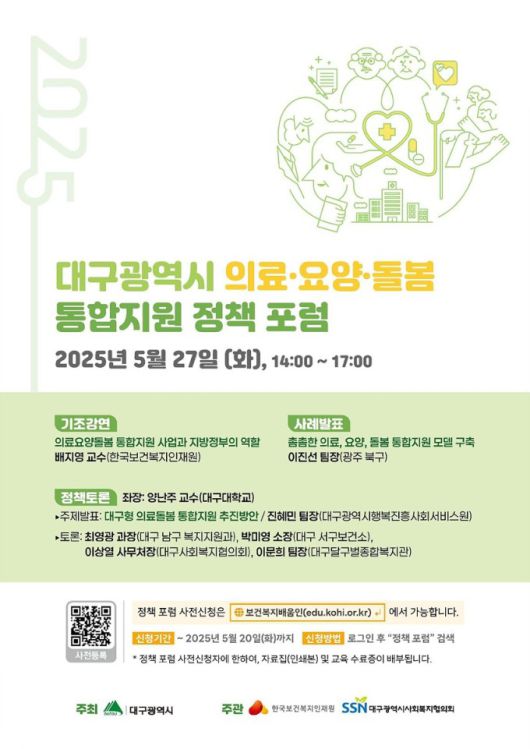 [대구=뉴스핌] 김용락 기자=대구광역시는 오는 27일 오후 2시, 대구어린이세상 꾀꼬리 극장에서 '의료·요양·돌봄 통합지원 정책포럼'을 시·도 최초로 개최한다.