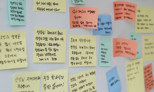 24일 제주도교육청에 마련된 분향소에서 학생 가족의 민원에 시달리다 숨진 40대 교사 A씨를 추모하는 메모가 부착돼 있다. 연합뉴스 |