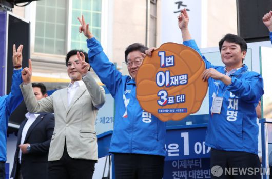 [천안=뉴스핌] 김학선 기자 =더불어민주당 이재명 대선 후보가 25일 오후 충남 천안 신부문화거리 유세장에서 유권자들의 지지를 호소하며 호두과자 모형의 피켓을 들어보이고 있다.2025.05.25 yooksa@newspim.com |