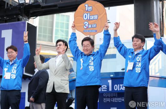[천안=뉴스핌] 김학선 기자 =더불어민주당 이재명 대선 후보가 25일 오후 충남 천안 신부문화거리 유세장에서 유권자들의 지지를 호소하며 호두과자 모형의 피켓을 들어보이고 있다.2025.05.25 yooksa@newspim.com