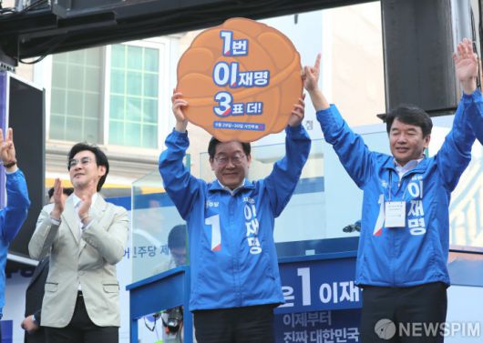 [천안=뉴스핌] 김학선 기자 =더불어민주당 이재명 대선 후보가 25일 오후 충남 천안 신부문화거리 유세장에서 유권자들의 지지를 호소하며 호두과자 모형의 피켓을 들어보이고 있다.2025.05.25 yooksa@newspim.com