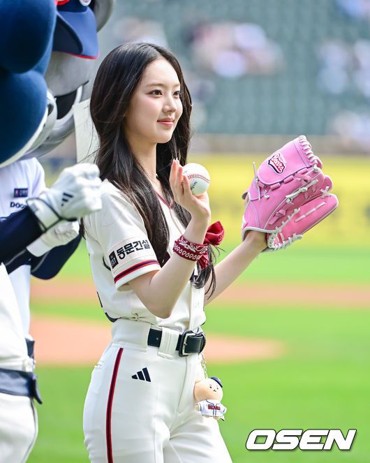 [OSEN=잠실, 지형준 기자] 신인 걸그룹 '키키'의 이솔이 25일 잠실야구장에서 열린 두산 베어스와NC 다이노스의 경기에서 승리기원 시구를 했다.