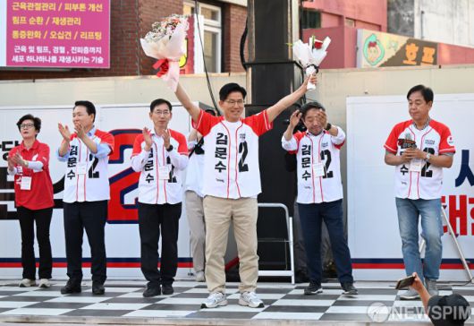 [당진=뉴스핌] 최지환 기자 = 김문수 국민의힘 대선후보가 25일 충남 당진시장에서 선거 유세를 하며 꽃다발을 들고 있다. 2025.05.25 choipix16@newspim.com |